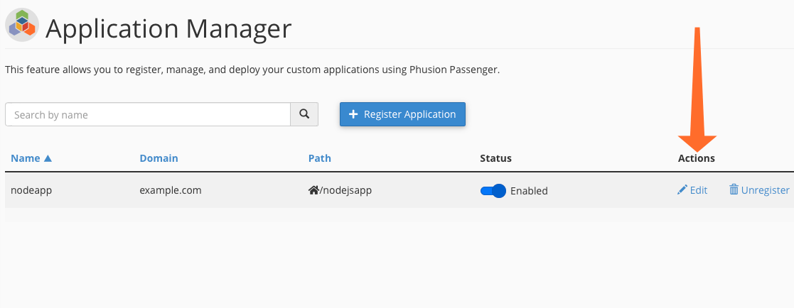 To uninstall or “unregister ”a Node.js application from cPanel, click the unregister link at the right of the Application Manager table.